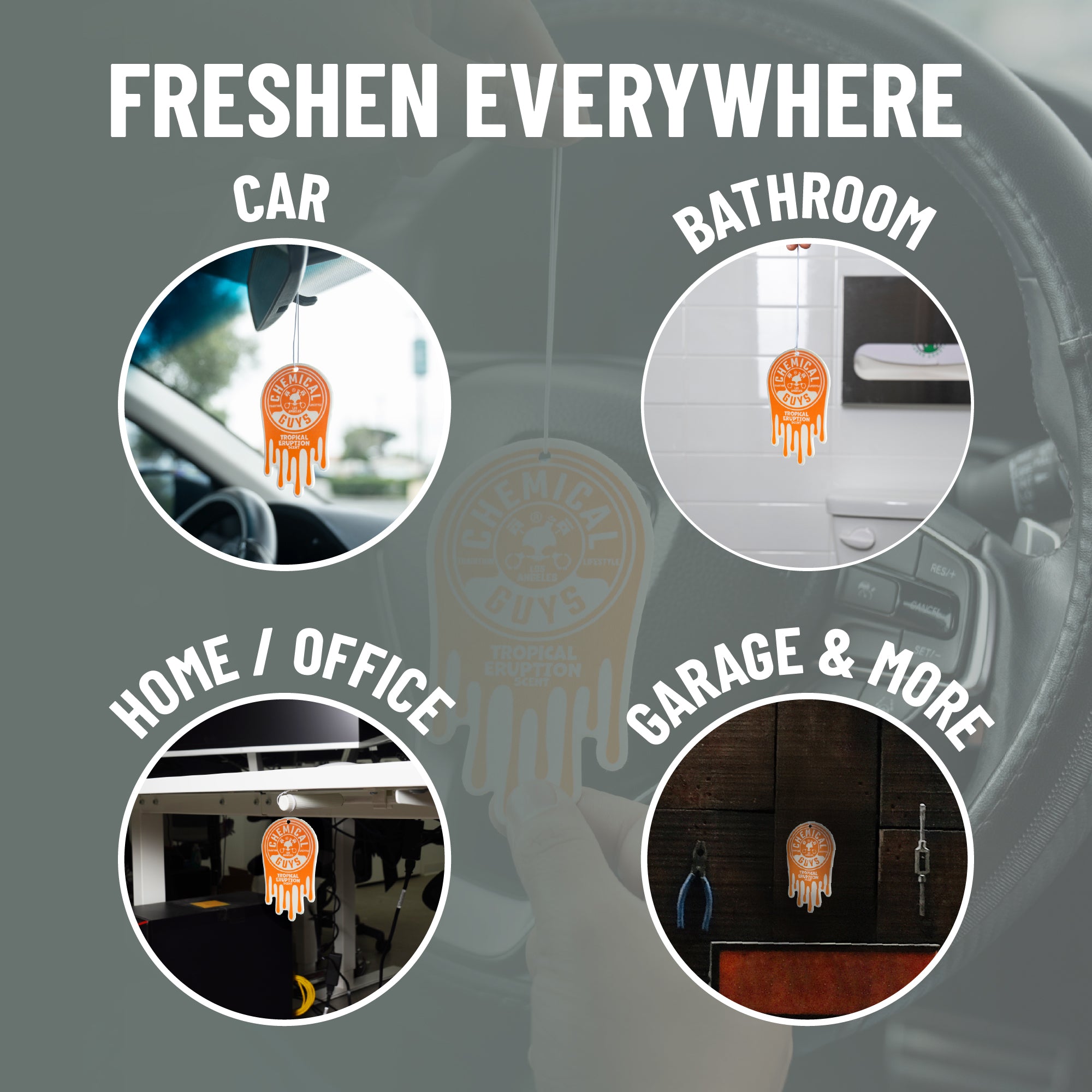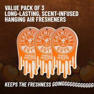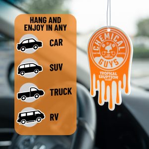 Chemical Guys Tropical Eruption Hanging Air Freshener fills your ride with a bold wave of exotic scents. blending zesty citrus. juicy tropical fruits. and a hint of warm sweetness. Make every drive feel like an escape to a lush volcanic island bursting with intoxicating tropical scents.?